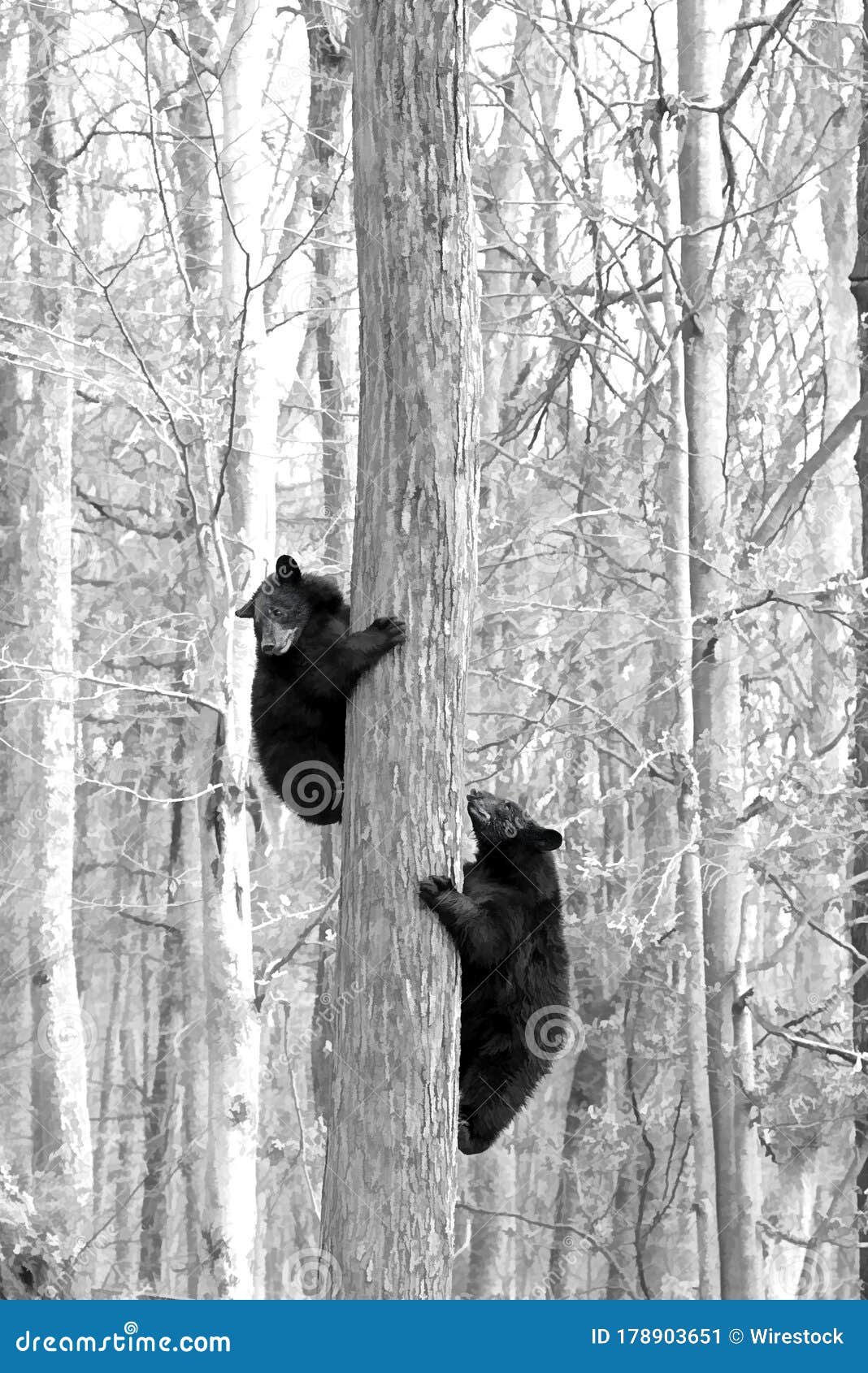 Vertical Greyscale Shot Of Two Black Bears Climbing The Tree Trunk Stock Image Image Of Wild Color 178903651